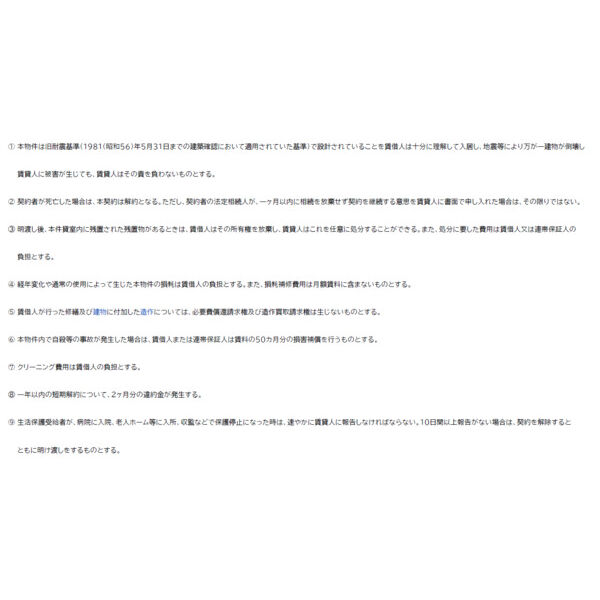 表示の賃料、共益費等には別途消費税を必要とします 1年未満解約違約金2ヵ月 その他・特約あり(データを送りますのでご連絡下さい) 倉庫としての使用を前提にお貸しします、設備は使えるものを使っていただいても問題ありませんが、修理交換等は行ないません。 火災保険等は別途ご用意ください。 |